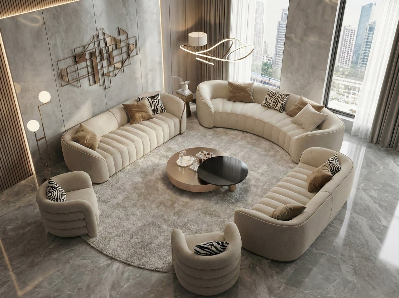 المقاس : كنبة 240سم + 2 كنبة 200سم + 2 فوتية + تربيزة قطر 60سم